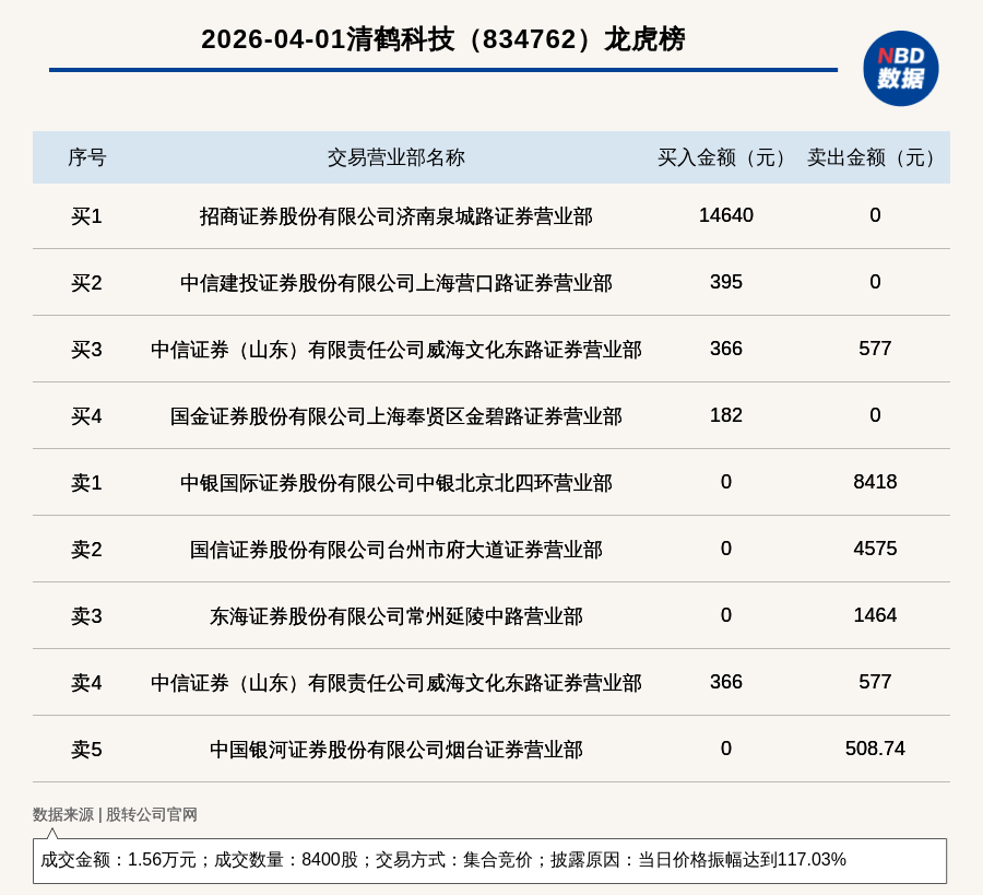 每經(jīng)訊,2026年4月1日,新三板創(chuàng)新層公司清鶴科技(834762,收盤價(jià):1.83元)登上龍虎榜,交易方式是集合競(jìng)價(jià),披露原因是當(dāng)日價(jià)格振幅達(dá)到117.03%,成交數(shù)量8400股,成交金額1.56萬元。買一席位為招商證券股份有限公司濟(jì)南泉城路證券營(yíng)業(yè)部,買入1.46萬元;賣一席位為中銀國(guó)際證券股份有限公司中銀北京北四環(huán)營(yíng)業(yè)部,賣出8418元。