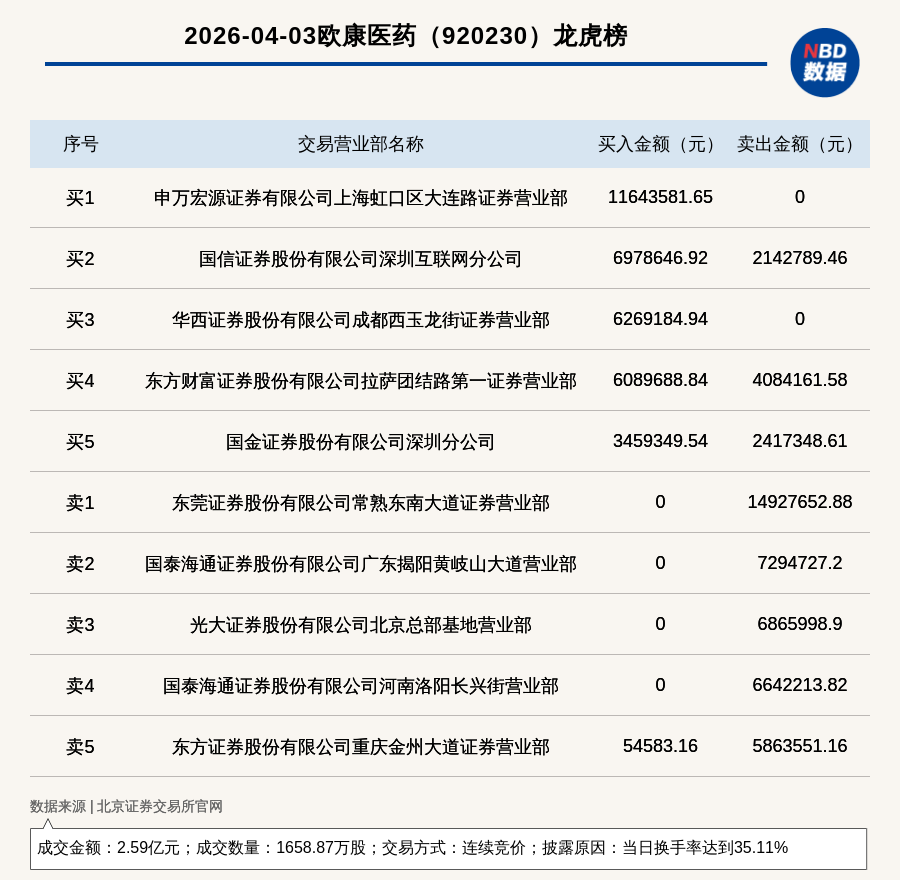 每經(jīng)訊,2026年4月3日,北交所上市公司歐康醫(yī)藥(920230,收盤價(jià):14.45元)登上龍虎榜,交易方式是連續(xù)競價(jià),披露原因是當(dāng)日換手率達(dá)到35.11%,成交數(shù)量1658.87萬股,成交金額2.59億元。買一席位為申萬宏源證券有限公司上海虹口區(qū)大連路證券營業(yè)部,買入1164.36萬元;賣一席位為東莞證券股份有限公司常熟東南大道證券營業(yè)部,賣出1492.77萬元。