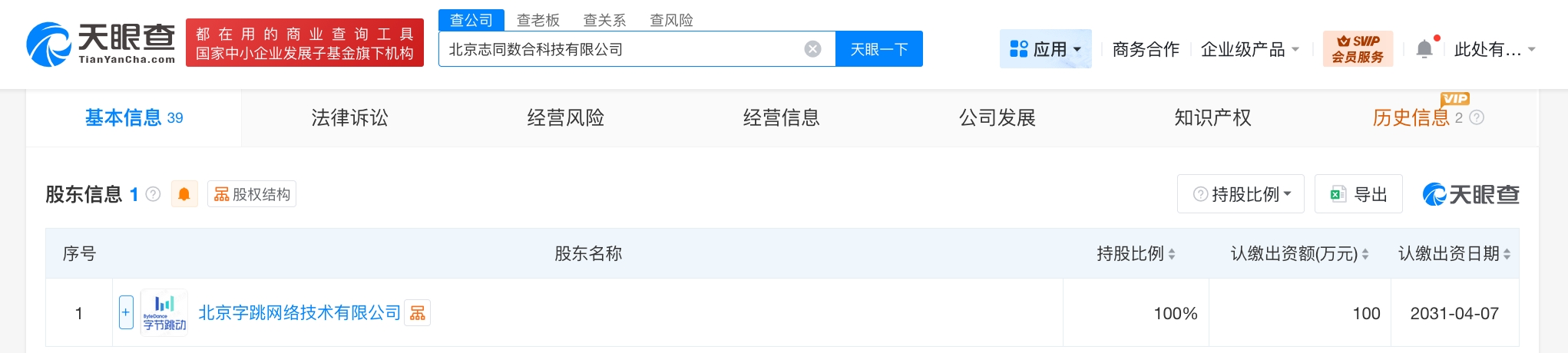 每經(jīng)AI快訊,天眼查App顯示,近日,北京志同數(shù)合科技有限公司成立,法定代表人為萬(wàn)丹丹,注冊(cè)資本100萬(wàn)元人民幣,經(jīng)營(yíng)范圍包括廣告設(shè)計(jì)、代理,廣告發(fā)布,計(jì)算機(jī)系統(tǒng)服務(wù),軟件開(kāi)發(fā),會(huì)議及展覽服務(wù)等。股東信息顯示,該公司由北京字跳網(wǎng)絡(luò)技術(shù)有限公司全資持股。