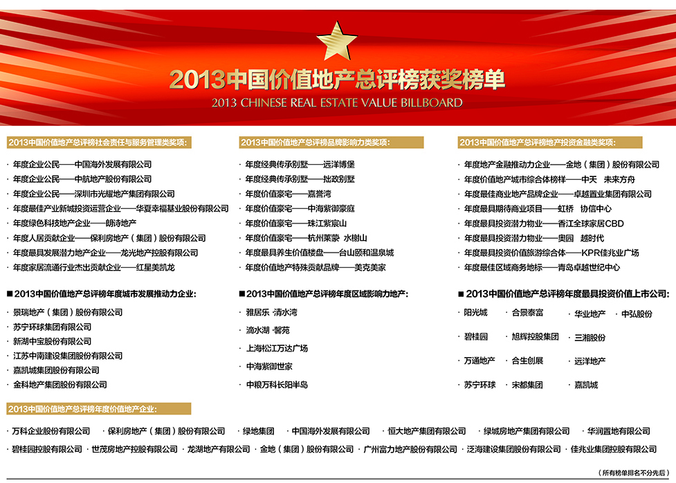 2013中國(guó)價(jià)值地產(chǎn)總評(píng)榜榜單