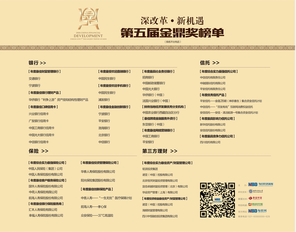“金鼎獎(jiǎng)” 作為《每日經(jīng)濟(jì)新聞》全力打造的核心品牌活動(dòng)之一,已經(jīng)成功舉辦四屆,其憑借專業(yè)、權(quán)威的評選標(biāo)準(zhǔn)得到了社會各界的廣泛 關(guān)注與認(rèn)可,成為冬季中國金融行業(yè)最受矚目的大事記。今年,《每日經(jīng)濟(jì)新聞》繼續(xù)聯(lián)合權(quán)威學(xué)術(shù)單位,運(yùn)用科學(xué)的模型和研究方法,為 中國高端投資者提供一份公正、權(quán)威的金融產(chǎn)品、品牌和團(tuán)隊(duì)機(jī)構(gòu)的榜單。