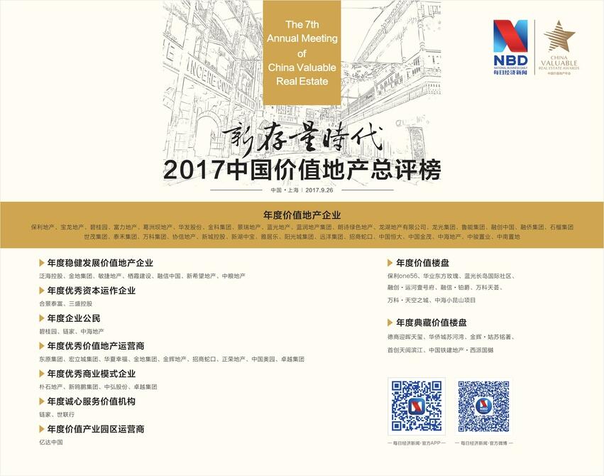 中國價值地產總評榜 2017中國價值地產總評榜“頒獎活動將與2017年9月26日的第七屆中國價值地產年會同日舉行,旨在給予地產行業(yè)企業(yè)、項目以公正、客觀的評價,并對優(yōu)秀企業(yè)及項目授予榮譽。 中國價值地產總評榜評選體系以總積分制排名,將第三方數據、上市公司市值、活躍指數、輿情、社會價值等方面進行綜合評價,充分考慮每一家地產企業(yè)的價值呈現,為行業(yè)的價值規(guī)范提供有效的指標。